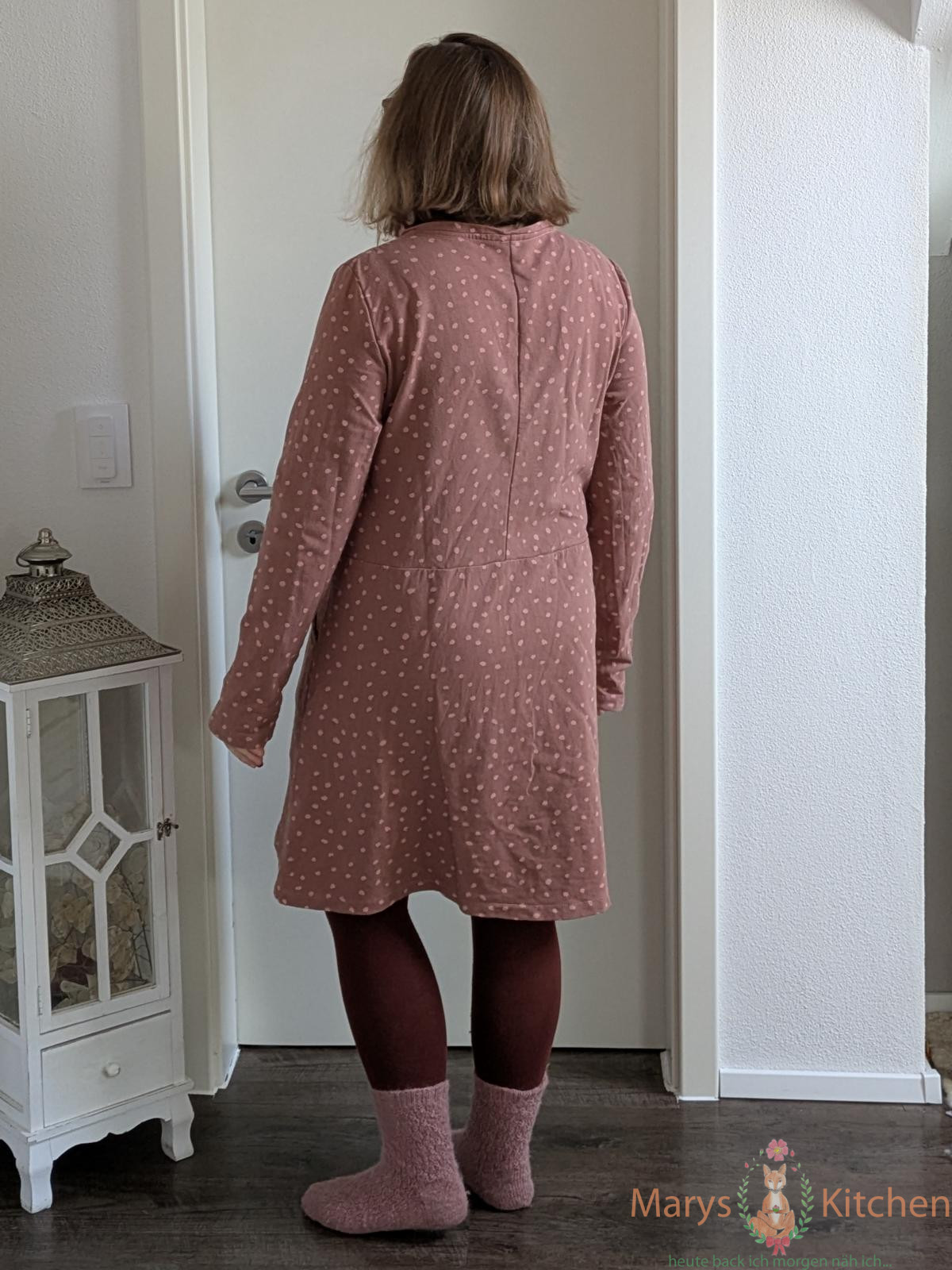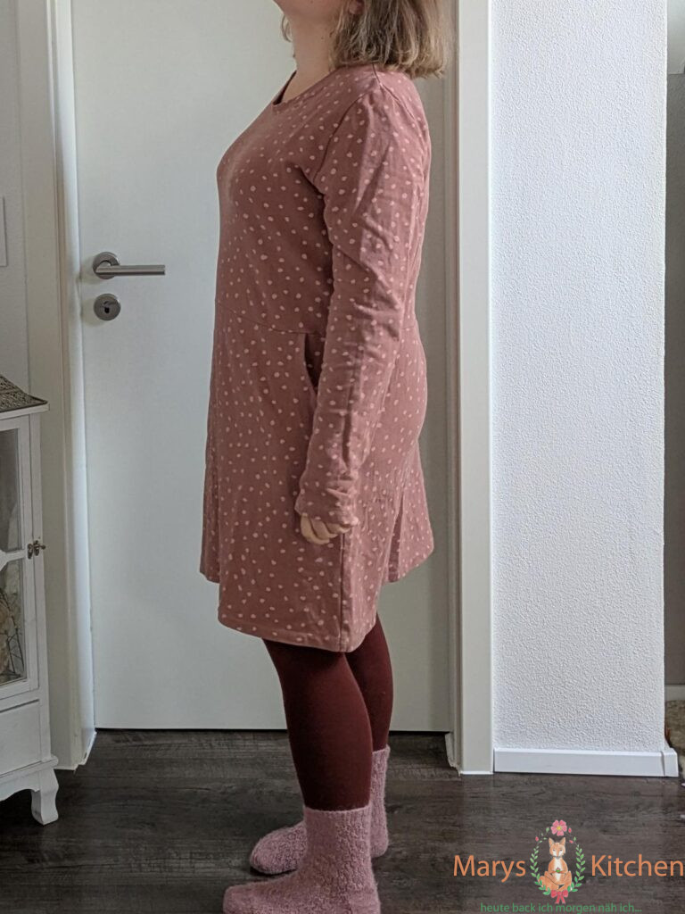 Der Sweatstoff habe ich sehr günstig bei sonetta im Outlet auf der Schwäbischen Schweiz letzten November gekauft. Er ist nicht so kombifreundlich, daher perfekt für ein Hauskleid, welches nur zu Strumpfhosen passen muss.