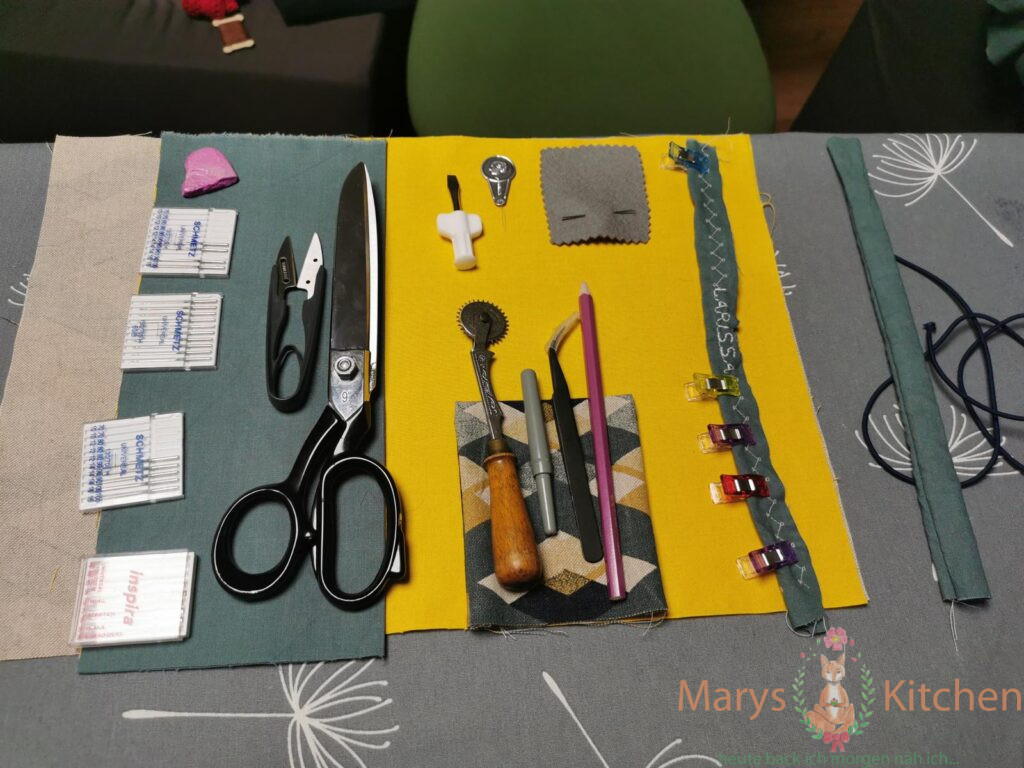 Hier sollte Platz für Nähmaschinennadeln, Scheren, Handmaß, Nahttrenner, Stift, Schraubenzieher, Pinsel, Nadeln, Klammern sein.