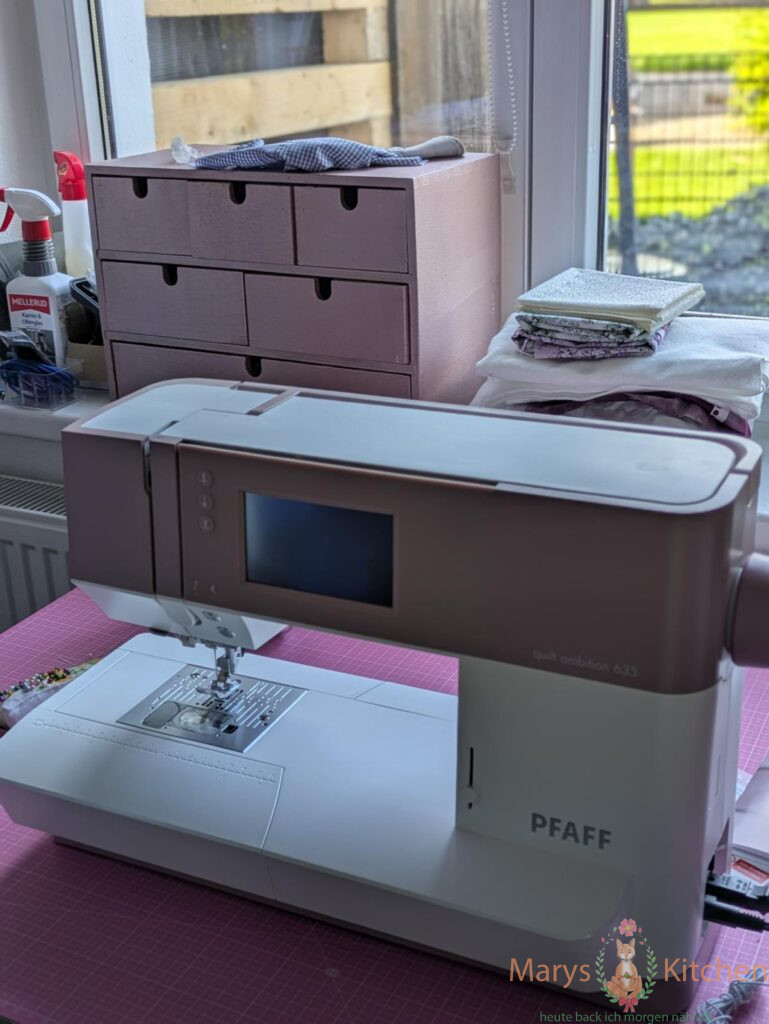 Bei meiner Freundin ist dieses Jahr eine besonders hübsche Nähmaschine eingezogen. Und passend dazu gab’s von mir eine Nähkommode in Glitzerpink lackiert mit nähtauglicher Füllung (Klammern, Nadeln, Auftrenner, ect.)