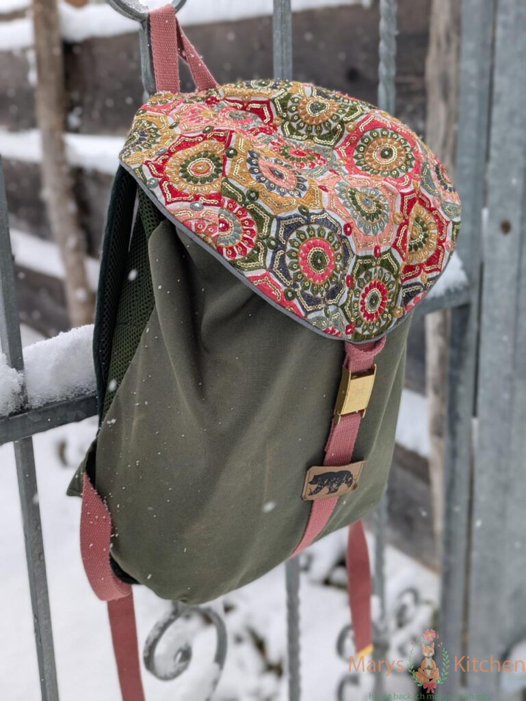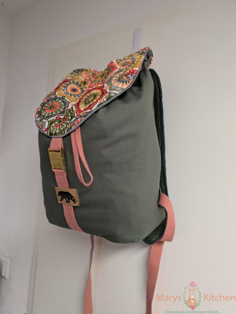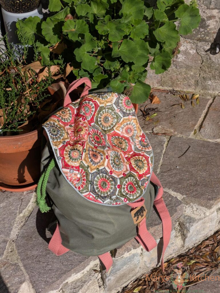 Highlight war ein kleines Stück hierfür gekauftes mit Pailletten und Stickerei versehenes Stück Stoff – mein bisher teuerstes Stück pro Meter… ob der Stoff die Belastungen im Alltag aushält? – 10 Monate später kann ich sagen, bisher hält jede Paillette! Und ja, der Stoff macht mir einfach jedes Mal gute Laune. Wenn die Sonne auf den Deckel des Rucksacks scheint und überall die Lichtreflektionen sind…sooo schön. Und farblich passen die Blumen halt zu allem was ich trage.