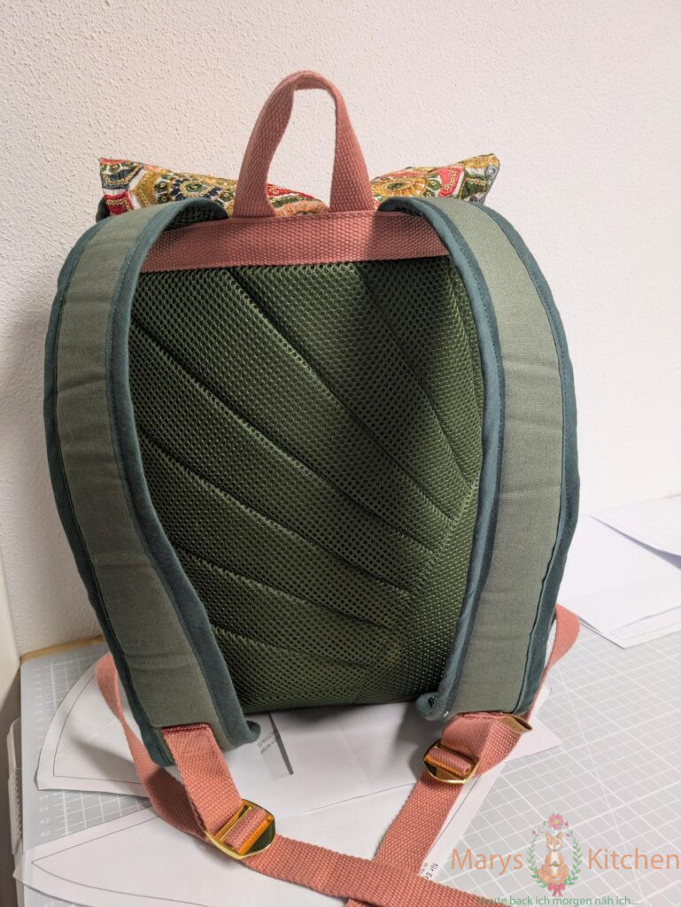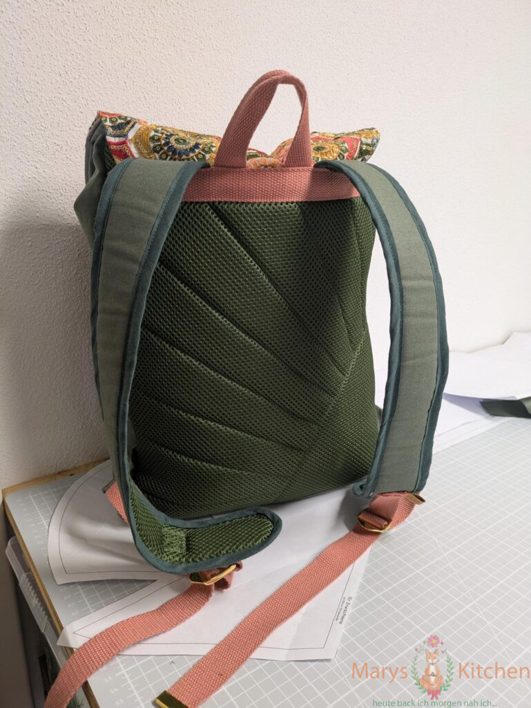 Das hat mir so geärgert, dass ich die verpatzte Naht innen im Deckel nicht wie geplant mit Handnähten gerettet habe. Ja, auch 10 Monate später ist da eine doofe sich auflösende Stoffkante. Aber ich trage trotz ausgeblichenem Außenstoff und Schandfleck im Deckel meinen Rucksack täglich zur Arbeit und für andere Aktivitäten.