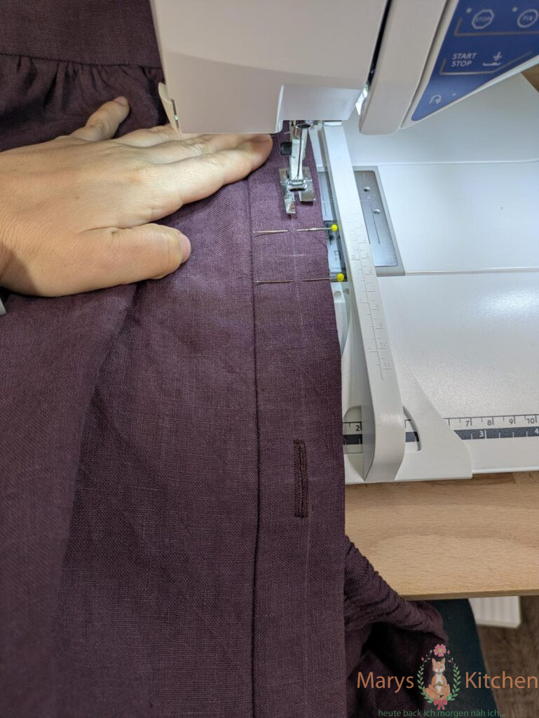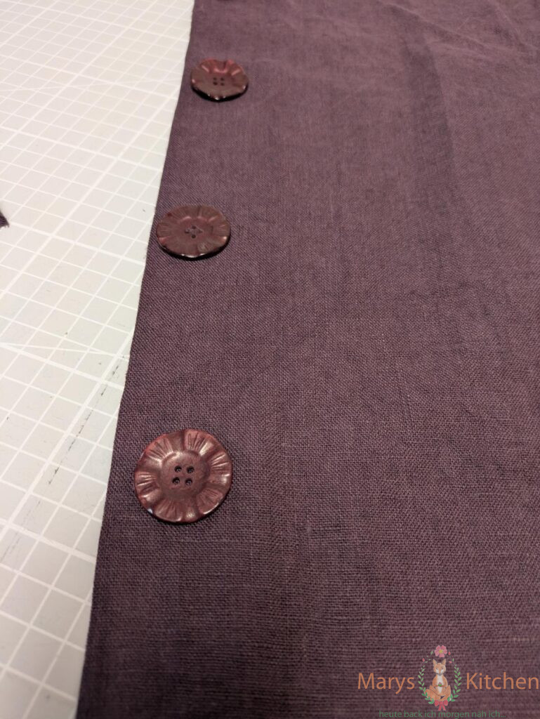 Ich hab mal wieder ein Knopfloch zu viel markiert – dadurch, dass der Rock ja nach den Knopflöchern aushängen darf, dann mit dem Rockabrunder gerade markiert wird, abgeschnitten wird und erst dann versäumt wird, passiert mir das öfter, dass ich zu viele Knopflöcher plane. So habe ich eben noch einen Ersatzknopf…