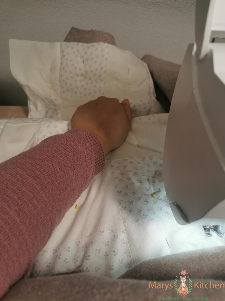 Als Füllung hab ich eine Ikea Kinderbettdecke genommen und diese + alle Stoffe bei 60 Grad vorgewaschen und in den Trockner gegeben.