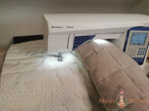 Hab Stecknadeln statt Sicherheitsnadeln genutzt – kann ich nicht empfehlen. Hab ziemlich viele Pflaster gebraucht und öfter krumm gequiltet, da ich den Quilt nicht genug packen konnte wegen Picks…