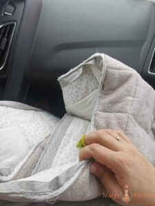 Die 4,12 m Binding hab ich per Hand in bisschen weniger als 4 Stunden genäht. Ging besser als gedacht. Ne Stunde auch während der Autofahrt, der Rest dann beim Babybesuch vor Ort.
