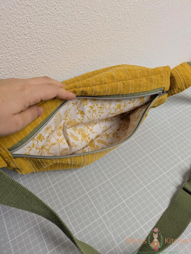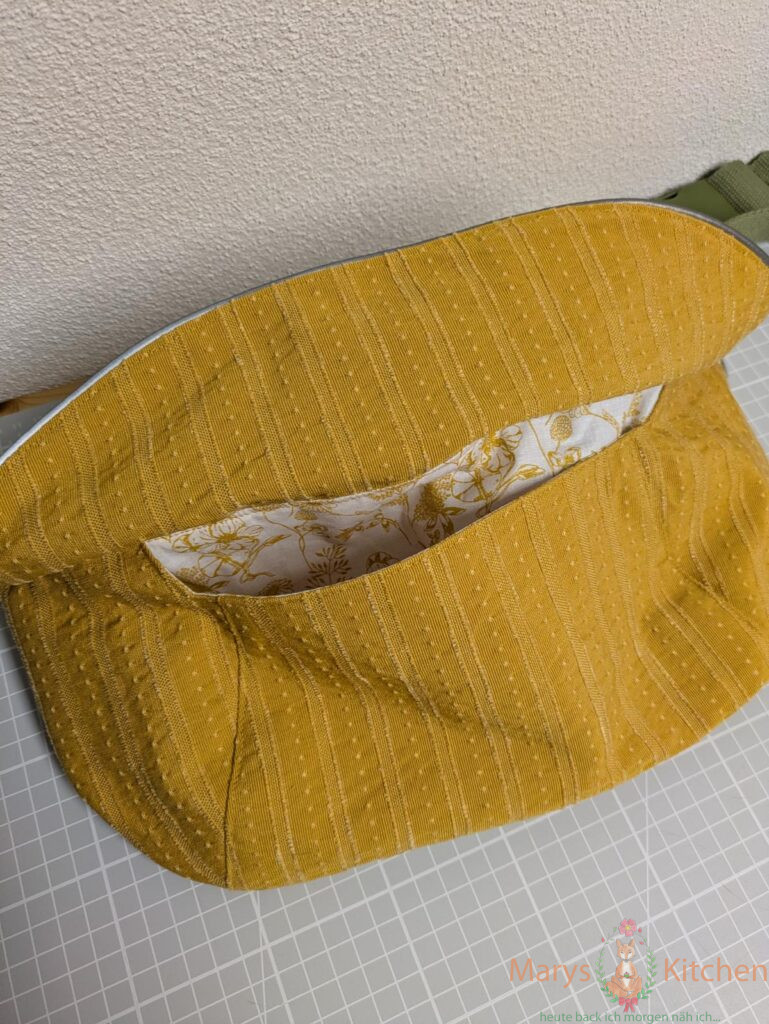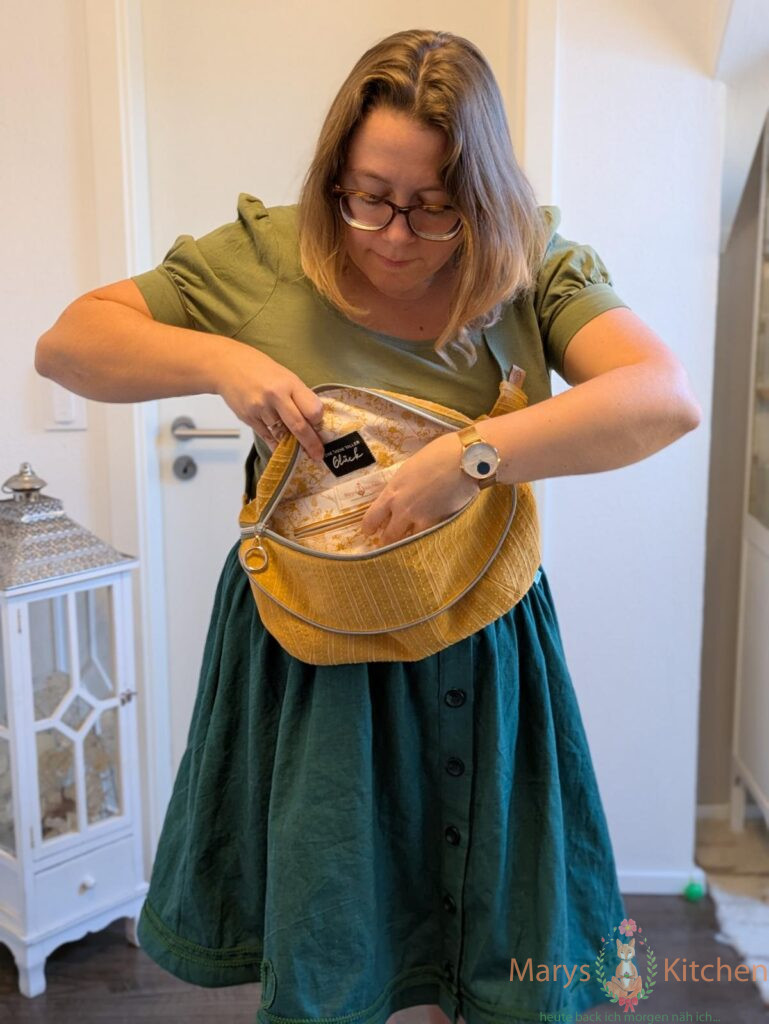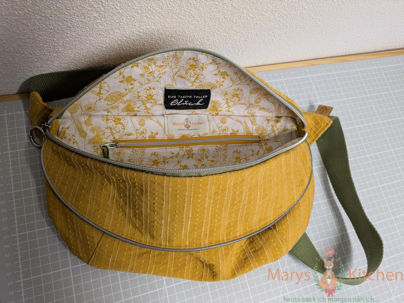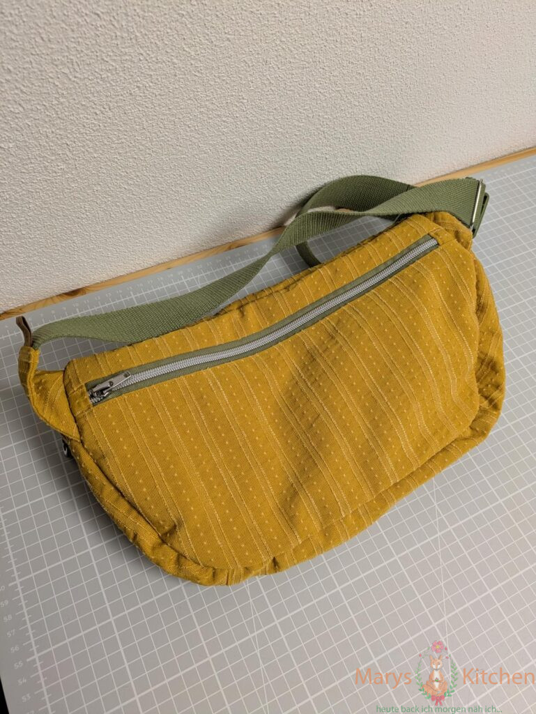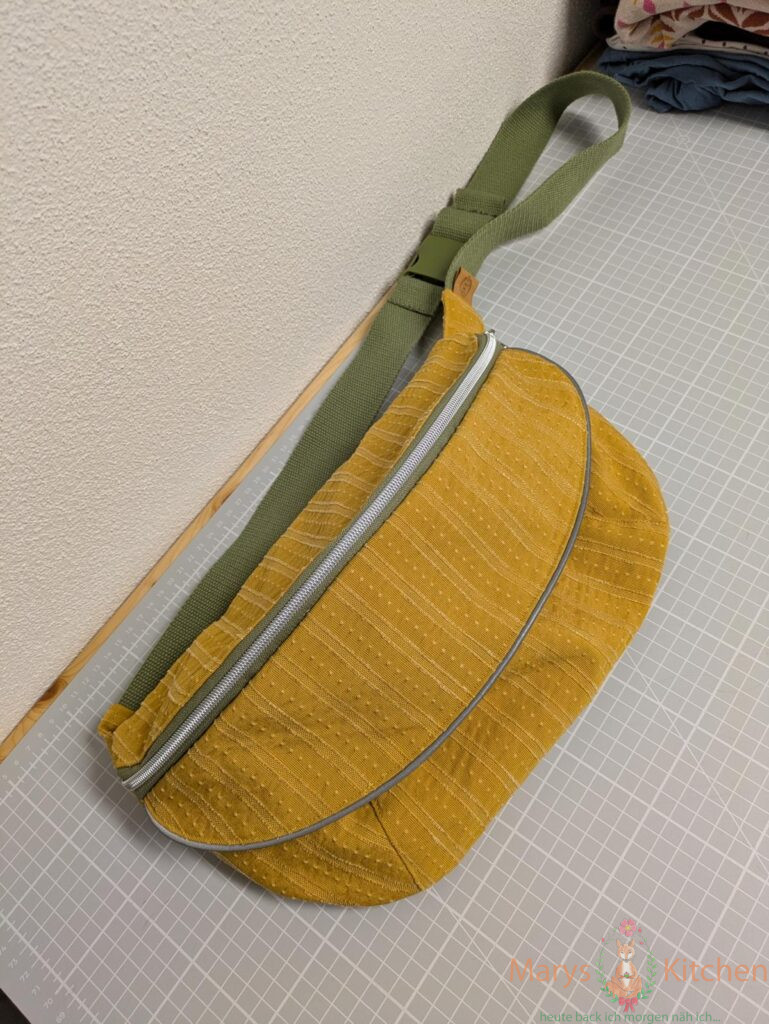 Irgendwann erwähnte meine Freundin, dass sie so eine Bauchtasche praktisch fände für die Ausflüge, wo man nicht so viel braucht (ich rätsel noch ein bisschen wie oft diese Ausflüge bei der 4fachen Mutter wirklich sind). Also gab’s im Juni einen Gutschein für eine Bauchtasche nach ihren Farbwünschen. Am Ende kam Senfgelb und bitte nicht bunt raus.