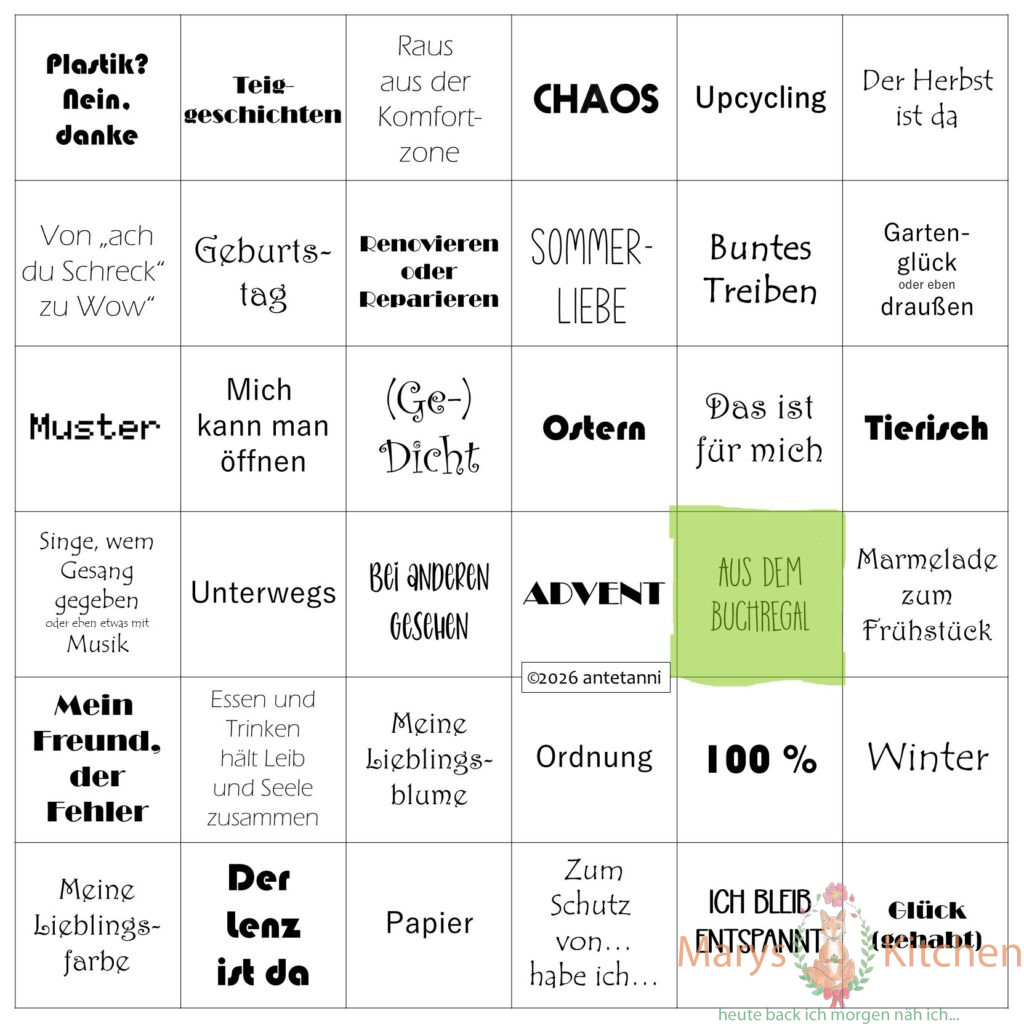 BINGO 2026 bei Antetanni – „Aus dem Buchregal“ passt somit auch perfekt. Mein erstes Kästchen für dieses Jahr. Wer ist mit dabei?